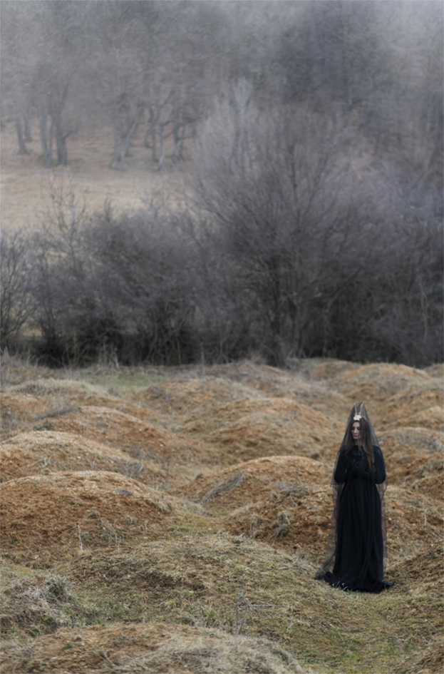 A hallmark of Raluca’s work is its meticulous planning. Her process begins long before the camera is ever lifted from its bag, often starting with a single word, a specific location, or a haunting phrase from a book. Inspiration for Raluca is often sudden and transformative. For instance, while reading Erin Morgenstern’s The Night Circus, she encountered a sentence describing a cabin lined with mirrors, each reflecting a different image of the character Prospero. This immediately triggered a vision for a project featuring an actor friend who is also a magician. She envisioned him in a room full of mirrors, with each reflection depicting a different facet of his identity: the actor, the magician, the lover, the masked man. Similarly, a walk in the woods can become an unplanned storyboard. Upon seeing symmetrical mounds on the edge of a forest, she immediately envisioned a "veiled woman with goat horns and feathers on her shoulders", a quiet guardian granting safe passage to another dimension.